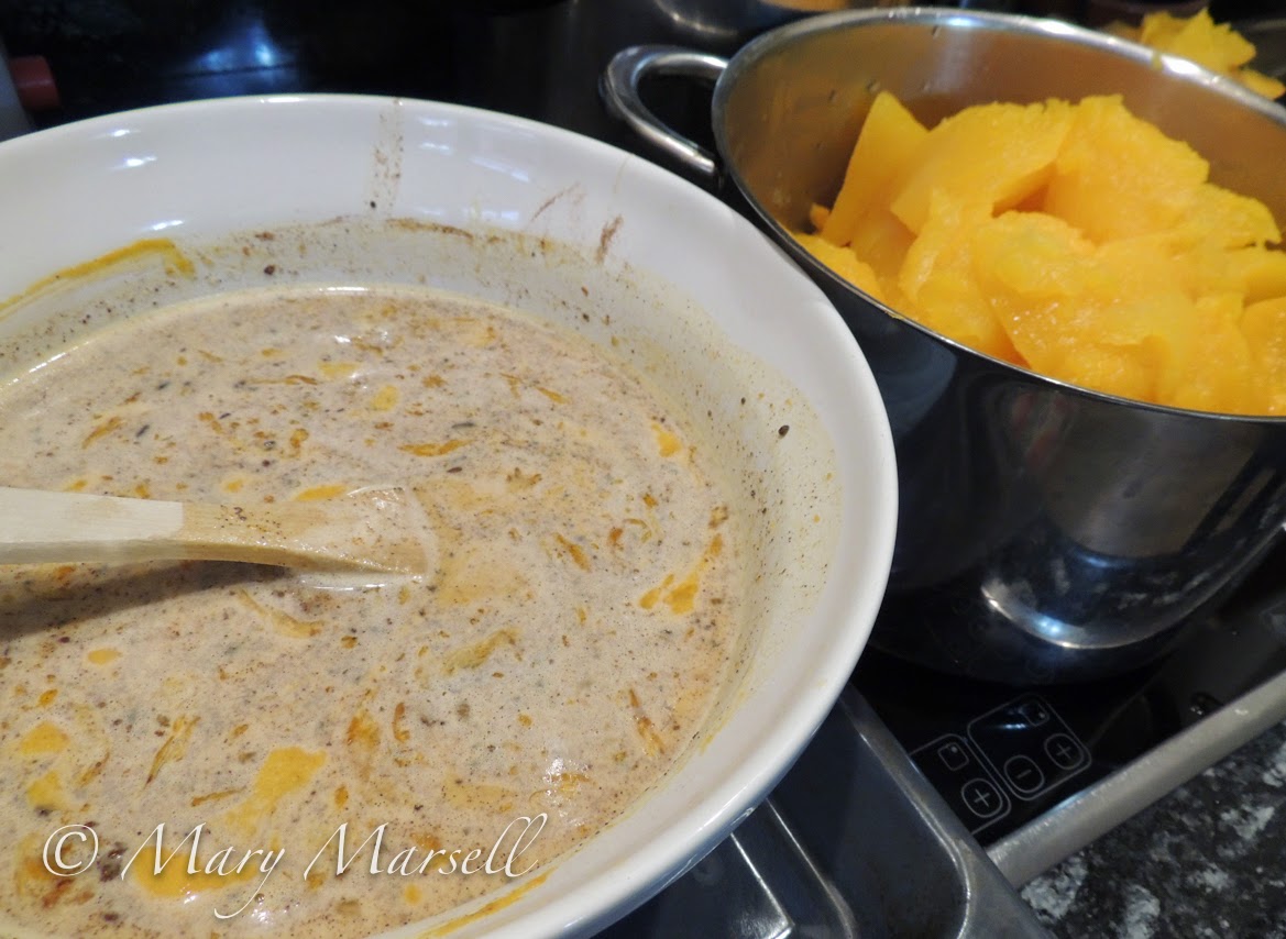 | Mashing boiled pumpkin and blending finest ingredients for pumpkin pie filling |